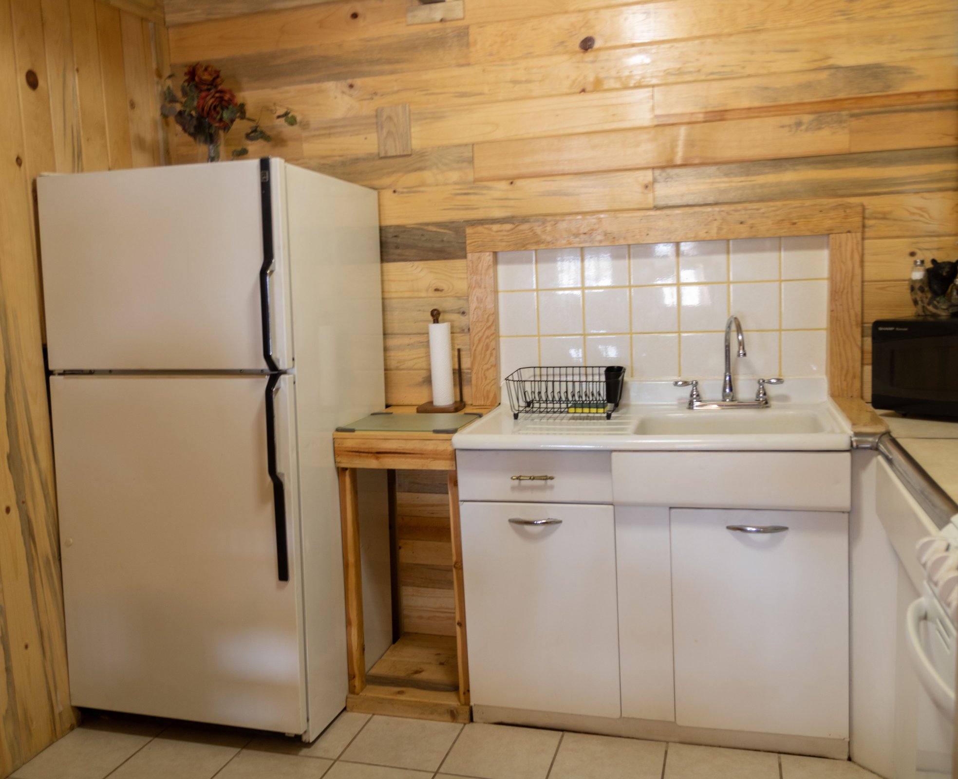 This queen bed room comes complete with a full, retro kitchen, full bath, and a living space with a TV/DVD player and a library of books. Dreaming of cozying up by your own wood-burning fireplace? Deer is for you!