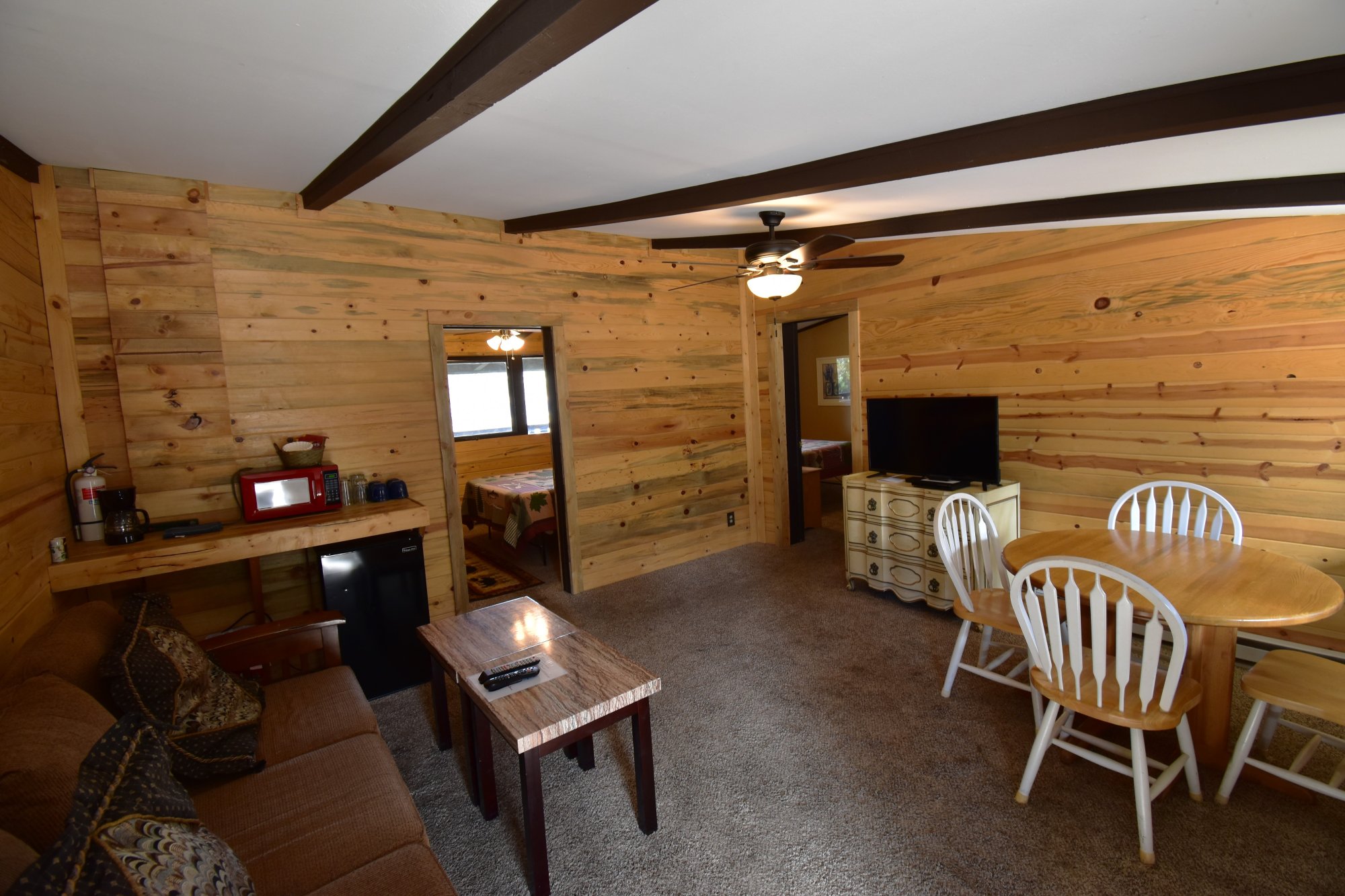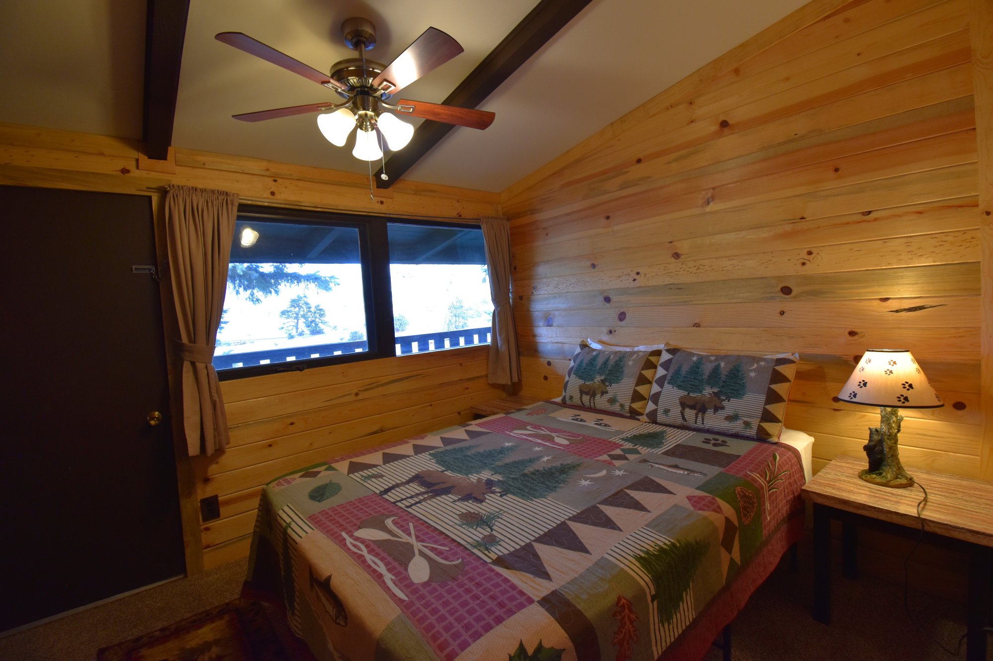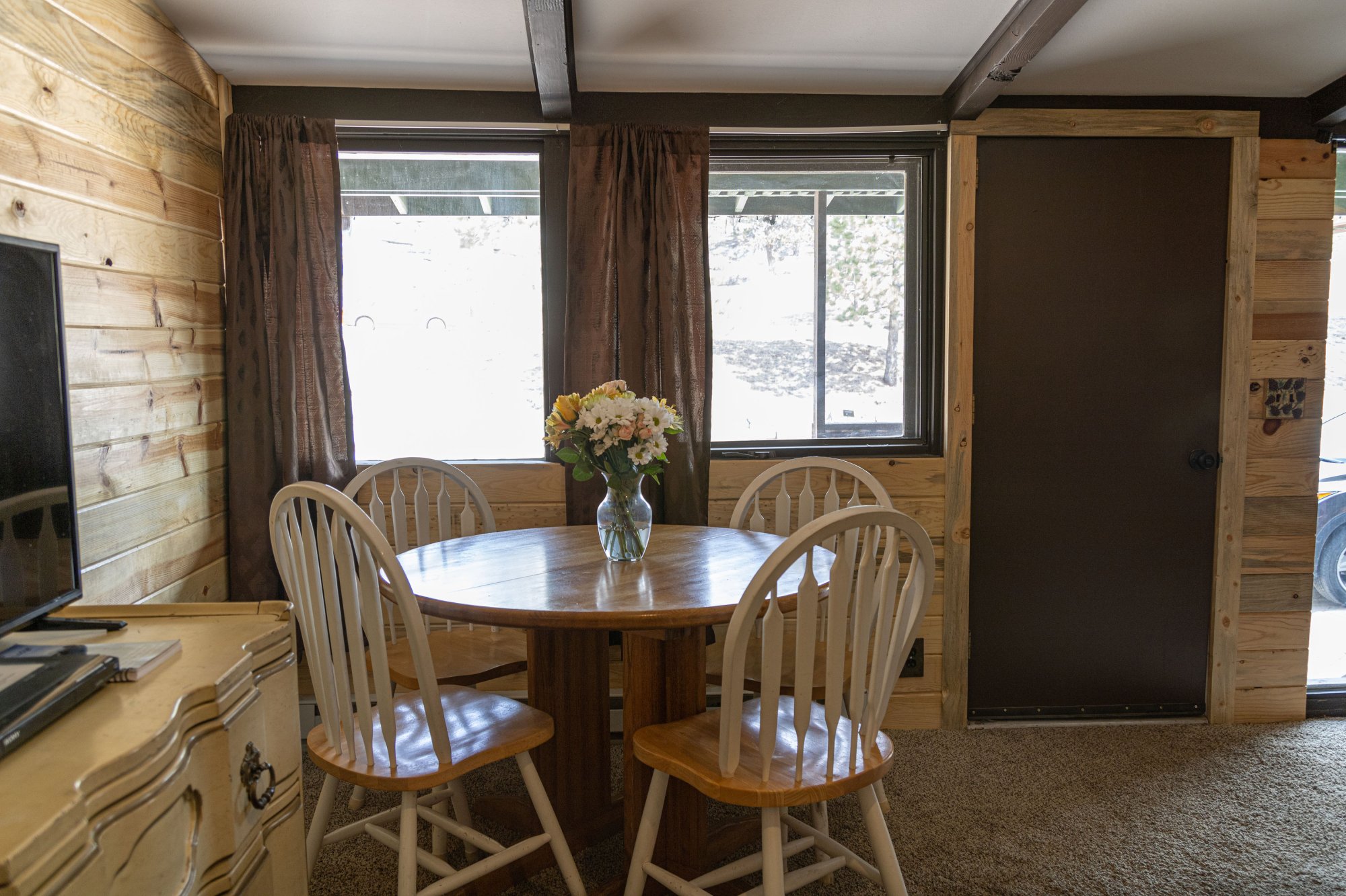 Perfect for couples looking for a romantic getaway or a family of up to five, this upstairs lodge room includes a beautiful deck view of the Continental Divide and the Mummy Range, Lake Estes, and the Town of Estes Park, including the Estes Park Fairgrounds and the Stanley Hotel, right off the main bedroom. Meeker has two bedrooms, each with a queen bed, with the bathroom with a shower (no tub) off the main bedroom. It boasts a living space with a couch, a TV with cable, DVD player, and a dining room. The small kitchenette includes a mini fridge, microwave, and coffee maker, but not a full kitchen. This can adjoin with Hallett Peak, which does have a full kitchen. Renting the adjoining room would give your stay a full kitchen, three beds, balconies, and 1.5 baths, with an occupancy of 6 adults.