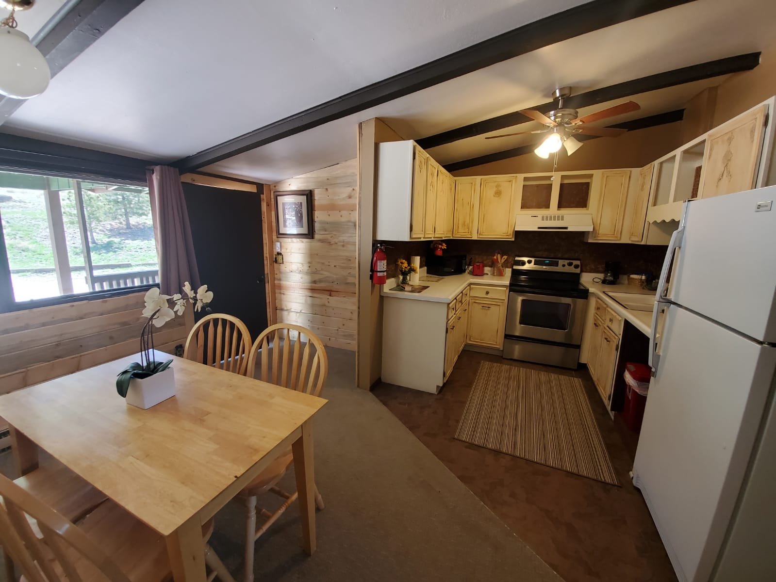 Perfect for couples looking for a romantic getaway, Prospect Mountain located in the upstairs of the Lakeside Building, comes complete with a beautiful view and a complete kitchen with everything you need to enjoy a homemade meal. Wake up in the morning to gorgeous views of the Continental Divide and the Mummy Range, Lake Estes, and the Town of Estes Park, including the Estes Park Fairgrounds and the Stanley Hotel. The bedroom includes a queen bed with an attached shower/tub in the bathroom suite.